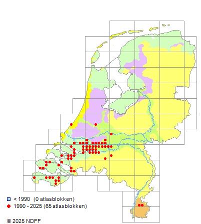 Het aantal atlasblokken (5x5 km) waarin de soort is gemeld binnen een periode van vijf jaar (vanaf 1980) of twintig jaar. Niet gecorrigeerd voor waarnemersinspanning en het aantal doorgegeven waarnemingen kan sterk variëren per periode, dus een trend in verspreiding kan hier niet direct uit worden afgelezen. Het opgegeven jaartal is het eerste jaar van de periode. Bron: gevalideerde waarnemingen uit de NDFF.