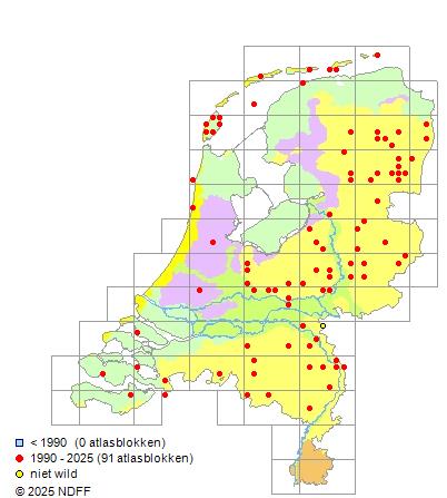 Het aantal atlasblokken (5x5 km) waarin de soort is gemeld binnen een periode van vijf jaar (vanaf 1980) of twintig jaar. Niet gecorrigeerd voor waarnemersinspanning en het aantal doorgegeven waarnemingen kan sterk variëren per periode, dus een trend in verspreiding kan hier niet direct uit worden afgelezen. Het opgegeven jaartal is het eerste jaar van de periode. Bron: gevalideerde waarnemingen uit de NDFF.