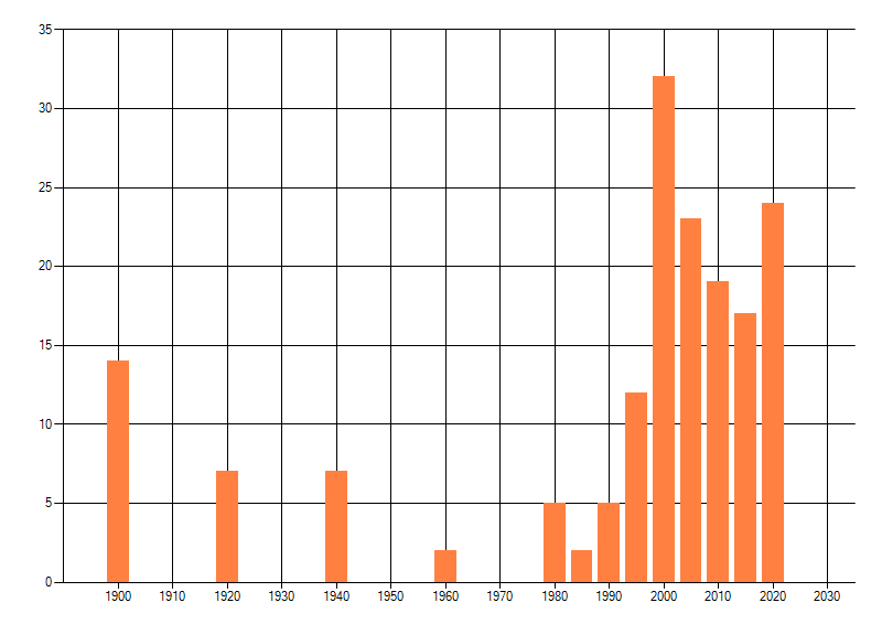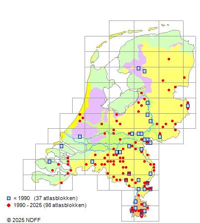 Het aantal atlasblokken (5x5 km) waarin de soort is gemeld binnen een periode van vijf jaar (vanaf 1980) of twintig jaar. Niet gecorrigeerd voor waarnemersinspanning en het aantal doorgegeven waarnemingen kan sterk variëren per periode, dus een trend in verspreiding kan hier niet direct uit worden afgelezen. Het opgegeven jaartal is het eerste jaar van de periode. Bron: gevalideerde waarnemingen uit de NDFF.