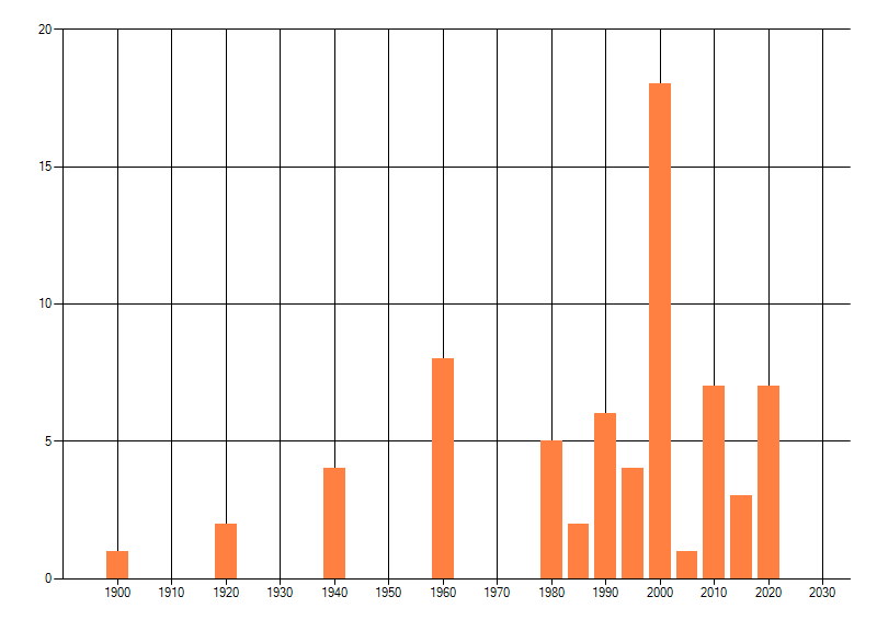 Het aantal atlasblokken (5x5 km) waarin de soort is gemeld binnen een periode van vijf jaar (vanaf 1980) of twintig jaar. Niet gecorrigeerd voor waarnemersinspanning en het aantal doorgegeven waarnemingen kan sterk variëren per periode, dus een trend in verspreiding kan hier niet direct uit worden afgelezen. Het opgegeven jaartal is het eerste jaar van de periode. Bron: gevalideerde waarnemingen uit de NDFF.