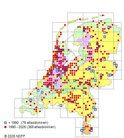 Het aantal atlasblokken (5x5 km) waarin de soort is gemeld binnen een periode van vijf jaar (vanaf 1980) of twintig jaar. Niet gecorrigeerd voor waarnemersinspanning en het aantal doorgegeven waarnemingen kan sterk variëren per periode, dus een trend in verspreiding kan hier niet direct uit worden afgelezen. Het opgegeven jaartal is het eerste jaar van de periode. Bron: gevalideerde waarnemingen uit de NDFF.