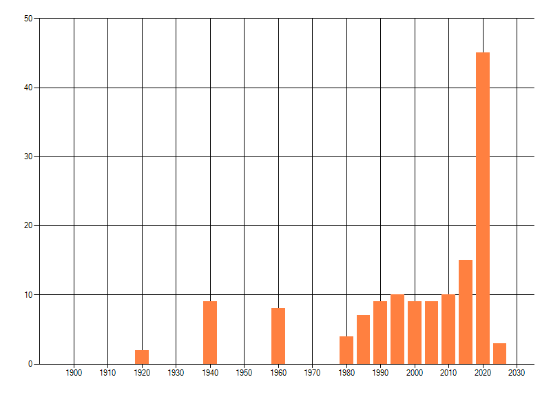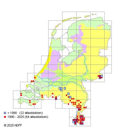 Het aantal atlasblokken (5x5 km) waarin de soort is gemeld binnen een periode van vijf jaar (vanaf 1980) of twintig jaar. Niet gecorrigeerd voor waarnemersinspanning en het aantal doorgegeven waarnemingen kan sterk variëren per periode, dus een trend in verspreiding kan hier niet direct uit worden afgelezen. Het opgegeven jaartal is het eerste jaar van de periode. Bron: gevalideerde waarnemingen uit de NDFF.