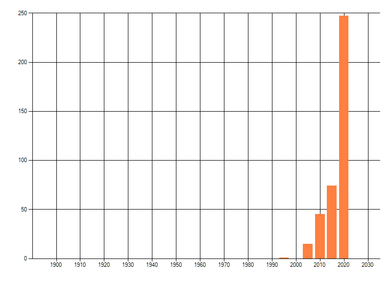 Het aantal atlasblokken (5x5 km) waarin de soort is gemeld binnen een periode van vijf jaar (vanaf 1980) of twintig jaar. Niet gecorrigeerd voor waarnemersinspanning en het aantal doorgegeven waarnemingen kan sterk variëren per periode, dus een trend in verspreiding kan hier niet direct uit worden afgelezen. Het opgegeven jaartal is het eerste jaar van de periode. Bron: gevalideerde waarnemingen uit de NDFF.