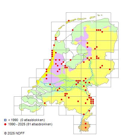 Het aantal atlasblokken (5x5 km) waarin de soort is gemeld binnen een periode van vijf jaar (vanaf 1980) of twintig jaar. Niet gecorrigeerd voor waarnemersinspanning en het aantal doorgegeven waarnemingen kan sterk variëren per periode, dus een trend in verspreiding kan hier niet direct uit worden afgelezen. Het opgegeven jaartal is het eerste jaar van de periode. Bron: gevalideerde waarnemingen uit de NDFF.