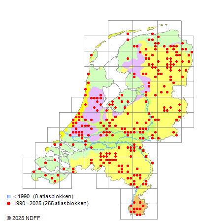 Het aantal atlasblokken (5x5 km) waarin de soort is gemeld binnen een periode van vijf jaar (vanaf 1980) of twintig jaar. Niet gecorrigeerd voor waarnemersinspanning en het aantal doorgegeven waarnemingen kan sterk variëren per periode, dus een trend in verspreiding kan hier niet direct uit worden afgelezen. Het opgegeven jaartal is het eerste jaar van de periode. Bron: gevalideerde waarnemingen uit de NDFF.
