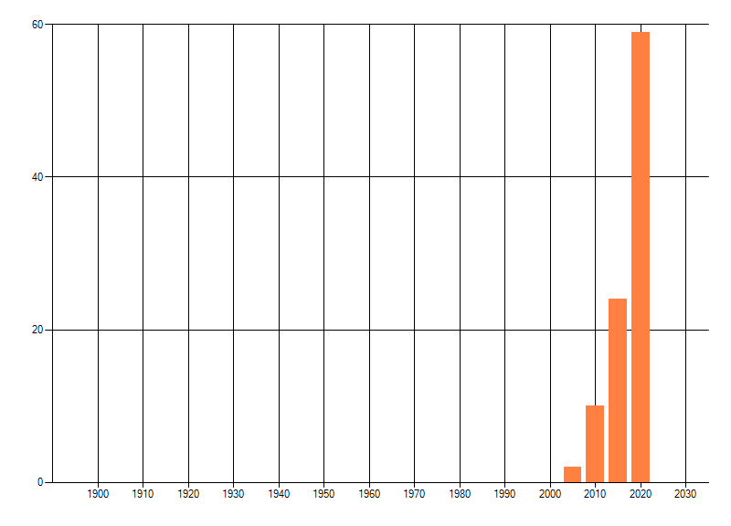 Het aantal atlasblokken (5x5 km) waarin de soort is gemeld binnen een periode van vijf jaar (vanaf 1980) of twintig jaar. Niet gecorrigeerd voor waarnemersinspanning en het aantal doorgegeven waarnemingen kan sterk variëren per periode, dus een trend in verspreiding kan hier niet direct uit worden afgelezen. Het opgegeven jaartal is het eerste jaar van de periode. Bron: gevalideerde waarnemingen uit de NDFF.