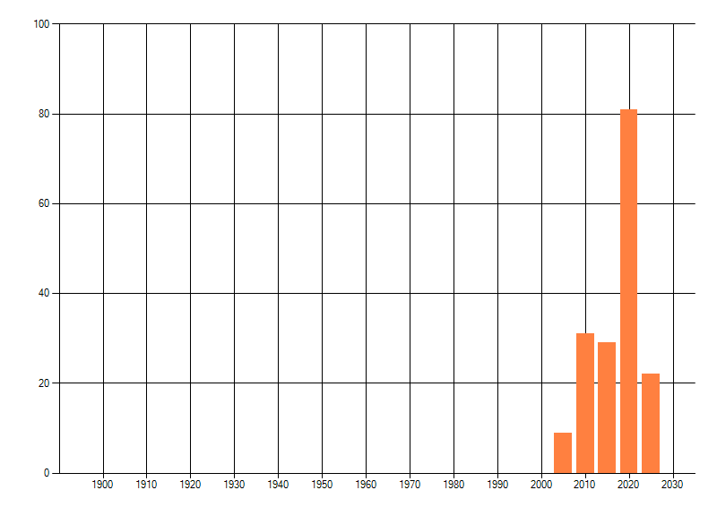 Het aantal atlasblokken (5x5 km) waarin de soort is gemeld binnen een periode van vijf jaar (vanaf 1980) of twintig jaar. Niet gecorrigeerd voor waarnemersinspanning en het aantal doorgegeven waarnemingen kan sterk variëren per periode, dus een trend in verspreiding kan hier niet direct uit worden afgelezen. Het opgegeven jaartal is het eerste jaar van de periode. Bron: gevalideerde waarnemingen uit de NDFF.