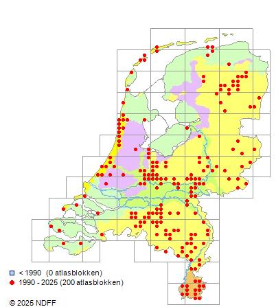 Het aantal atlasblokken (5x5 km) waarin de soort is gemeld binnen een periode van vijf jaar (vanaf 1980) of twintig jaar. Niet gecorrigeerd voor waarnemersinspanning en het aantal doorgegeven waarnemingen kan sterk variëren per periode, dus een trend in verspreiding kan hier niet direct uit worden afgelezen. Het opgegeven jaartal is het eerste jaar van de periode. Bron: gevalideerde waarnemingen uit de NDFF.