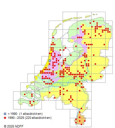 Het aantal atlasblokken (5x5 km) waarin de soort is gemeld binnen een periode van vijf jaar (vanaf 1980) of twintig jaar. Niet gecorrigeerd voor waarnemersinspanning en het aantal doorgegeven waarnemingen kan sterk variëren per periode, dus een trend in verspreiding kan hier niet direct uit worden afgelezen. Het opgegeven jaartal is het eerste jaar van de periode. Bron: gevalideerde waarnemingen uit de NDFF.
