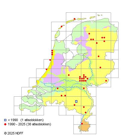 Het aantal atlasblokken (5x5 km) waarin de soort is gemeld binnen een periode van vijf jaar (vanaf 1980) of twintig jaar. Niet gecorrigeerd voor waarnemersinspanning en het aantal doorgegeven waarnemingen kan sterk variëren per periode, dus een trend in verspreiding kan hier niet direct uit worden afgelezen. Het opgegeven jaartal is het eerste jaar van de periode. Bron: gevalideerde waarnemingen uit de NDFF.