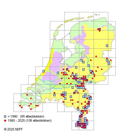 Het aantal atlasblokken (5x5 km) waarin de soort is gemeld binnen een periode van vijf jaar (vanaf 1980) of twintig jaar. Niet gecorrigeerd voor waarnemersinspanning en het aantal doorgegeven waarnemingen kan sterk variëren per periode, dus een trend in verspreiding kan hier niet direct uit worden afgelezen. Het opgegeven jaartal is het eerste jaar van de periode. Bron: gevalideerde waarnemingen uit de NDFF.