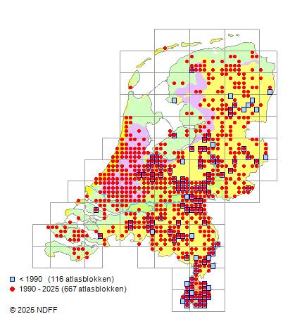 Het aantal atlasblokken (5x5 km) waarin de soort is gemeld binnen een periode van vijf jaar (vanaf 1980) of twintig jaar. Niet gecorrigeerd voor waarnemersinspanning en het aantal doorgegeven waarnemingen kan sterk variëren per periode, dus een trend in verspreiding kan hier niet direct uit worden afgelezen. Het opgegeven jaartal is het eerste jaar van de periode. Bron: gevalideerde waarnemingen uit de NDFF.