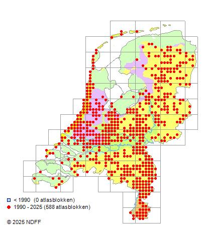 Het aantal atlasblokken (5x5 km) waarin de soort is gemeld binnen een periode van vijf jaar (vanaf 1980) of twintig jaar. Niet gecorrigeerd voor waarnemersinspanning en het aantal doorgegeven waarnemingen kan sterk variëren per periode, dus een trend in verspreiding kan hier niet direct uit worden afgelezen. Het opgegeven jaartal is het eerste jaar van de periode. Bron: gevalideerde waarnemingen uit de NDFF.