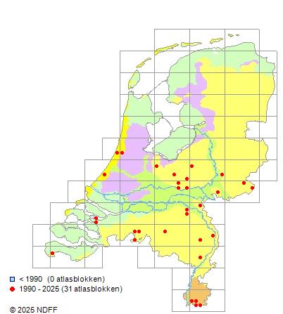 Het aantal atlasblokken (5x5 km) waarin de soort is gemeld binnen een periode van vijf jaar (vanaf 1980) of twintig jaar. Niet gecorrigeerd voor waarnemersinspanning en het aantal doorgegeven waarnemingen kan sterk variëren per periode, dus een trend in verspreiding kan hier niet direct uit worden afgelezen. Het opgegeven jaartal is het eerste jaar van de periode. Bron: gevalideerde waarnemingen uit de NDFF.