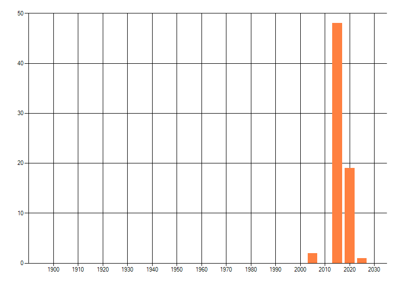 Het aantal atlasblokken (5x5 km) waarin de soort is gemeld binnen een periode van vijf jaar (vanaf 1980) of twintig jaar. Niet gecorrigeerd voor waarnemersinspanning en het aantal doorgegeven waarnemingen kan sterk variëren per periode, dus een trend in verspreiding kan hier niet direct uit worden afgelezen. Het opgegeven jaartal is het eerste jaar van de periode. Bron: gevalideerde waarnemingen uit de NDFF.
