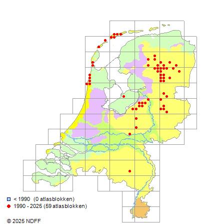 Het aantal atlasblokken (5x5 km) waarin de soort is gemeld binnen een periode van vijf jaar (vanaf 1980) of twintig jaar. Niet gecorrigeerd voor waarnemersinspanning en het aantal doorgegeven waarnemingen kan sterk variëren per periode, dus een trend in verspreiding kan hier niet direct uit worden afgelezen. Het opgegeven jaartal is het eerste jaar van de periode. Bron: gevalideerde waarnemingen uit de NDFF.