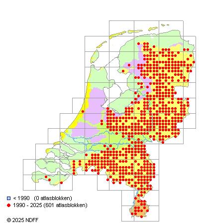Het aantal atlasblokken (5x5 km) waarin de soort is gemeld binnen een periode van vijf jaar (vanaf 1980) of twintig jaar. Niet gecorrigeerd voor waarnemersinspanning en het aantal doorgegeven waarnemingen kan sterk variëren per periode, dus een trend in verspreiding kan hier niet direct uit worden afgelezen. Het opgegeven jaartal is het eerste jaar van de periode. Bron: gevalideerde waarnemingen uit de NDFF.