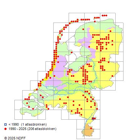 Het aantal atlasblokken (5x5 km) waarin de soort is gemeld binnen een periode van vijf jaar (vanaf 1980) of twintig jaar. Niet gecorrigeerd voor waarnemersinspanning en het aantal doorgegeven waarnemingen kan sterk variëren per periode, dus een trend in verspreiding kan hier niet direct uit worden afgelezen. Het opgegeven jaartal is het eerste jaar van de periode. Bron: gevalideerde waarnemingen uit de NDFF.