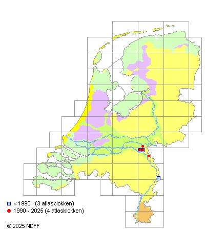 Het aantal atlasblokken (5x5 km) waarin de soort is gemeld binnen een periode van vijf jaar (vanaf 1980) of twintig jaar. Niet gecorrigeerd voor waarnemersinspanning en het aantal doorgegeven waarnemingen kan sterk variëren per periode, dus een trend in verspreiding kan hier niet direct uit worden afgelezen. Het opgegeven jaartal is het eerste jaar van de periode. Bron: gevalideerde waarnemingen uit de NDFF.