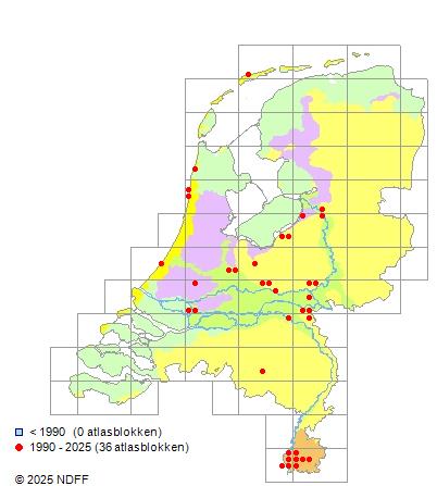 Het aantal atlasblokken (5x5 km) waarin de soort is gemeld binnen een periode van vijf jaar (vanaf 1980) of twintig jaar. Niet gecorrigeerd voor waarnemersinspanning en het aantal doorgegeven waarnemingen kan sterk variëren per periode, dus een trend in verspreiding kan hier niet direct uit worden afgelezen. Het opgegeven jaartal is het eerste jaar van de periode. Bron: gevalideerde waarnemingen uit de NDFF.