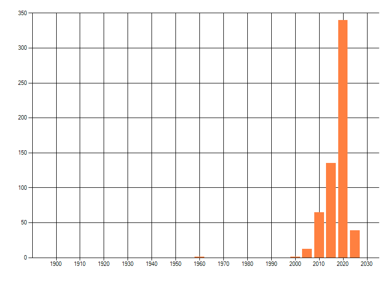 Het aantal atlasblokken (5x5 km) waarin de soort is gemeld binnen een periode van vijf jaar (vanaf 1980) of twintig jaar. Niet gecorrigeerd voor waarnemersinspanning en het aantal doorgegeven waarnemingen kan sterk variëren per periode, dus een trend in verspreiding kan hier niet direct uit worden afgelezen. Het opgegeven jaartal is het eerste jaar van de periode. Bron: gevalideerde waarnemingen uit de NDFF.
