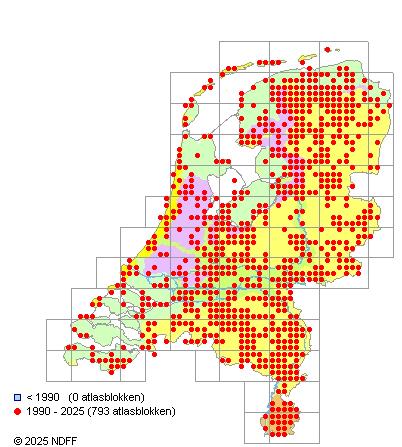 Het aantal atlasblokken (5x5 km) waarin de soort is gemeld binnen een periode van vijf jaar (vanaf 1980) of twintig jaar. Niet gecorrigeerd voor waarnemersinspanning en het aantal doorgegeven waarnemingen kan sterk variëren per periode, dus een trend in verspreiding kan hier niet direct uit worden afgelezen. Het opgegeven jaartal is het eerste jaar van de periode. Bron: gevalideerde waarnemingen uit de NDFF.
