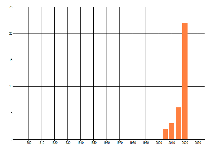 Het aantal atlasblokken (5x5 km) waarin de soort is gemeld binnen een periode van vijf jaar (vanaf 1980) of twintig jaar. Niet gecorrigeerd voor waarnemersinspanning en het aantal doorgegeven waarnemingen kan sterk variëren per periode, dus een trend in verspreiding kan hier niet direct uit worden afgelezen. Het opgegeven jaartal is het eerste jaar van de periode. Bron: gevalideerde waarnemingen uit de NDFF.