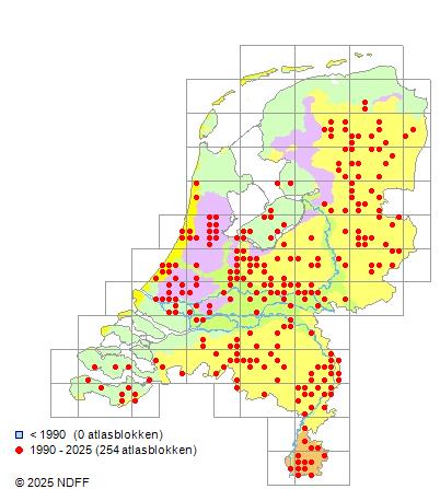Het aantal atlasblokken (5x5 km) waarin de soort is gemeld binnen een periode van vijf jaar (vanaf 1980) of twintig jaar. Niet gecorrigeerd voor waarnemersinspanning en het aantal doorgegeven waarnemingen kan sterk variëren per periode, dus een trend in verspreiding kan hier niet direct uit worden afgelezen. Het opgegeven jaartal is het eerste jaar van de periode. Bron: gevalideerde waarnemingen uit de NDFF.