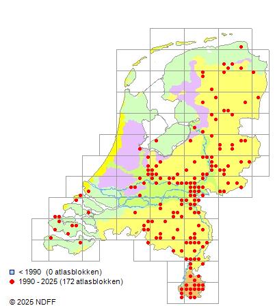 Het aantal atlasblokken (5x5 km) waarin de soort is gemeld binnen een periode van vijf jaar (vanaf 1980) of twintig jaar. Niet gecorrigeerd voor waarnemersinspanning en het aantal doorgegeven waarnemingen kan sterk variëren per periode, dus een trend in verspreiding kan hier niet direct uit worden afgelezen. Het opgegeven jaartal is het eerste jaar van de periode. Bron: gevalideerde waarnemingen uit de NDFF.