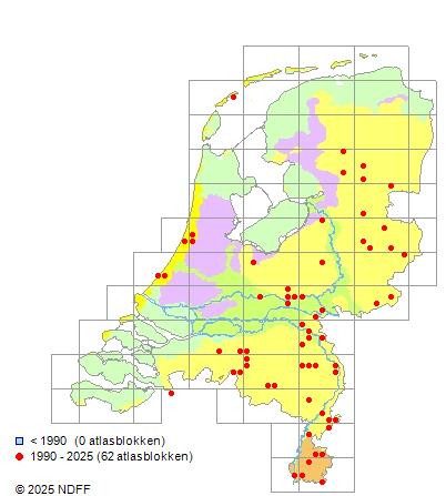 Het aantal atlasblokken (5x5 km) waarin de soort is gemeld binnen een periode van vijf jaar (vanaf 1980) of twintig jaar. Niet gecorrigeerd voor waarnemersinspanning en het aantal doorgegeven waarnemingen kan sterk variëren per periode, dus een trend in verspreiding kan hier niet direct uit worden afgelezen. Het opgegeven jaartal is het eerste jaar van de periode. Bron: gevalideerde waarnemingen uit de NDFF.