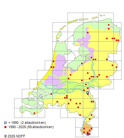 Het aantal atlasblokken (5x5 km) waarin de soort is gemeld binnen een periode van vijf jaar (vanaf 1980) of twintig jaar. Niet gecorrigeerd voor waarnemersinspanning en het aantal doorgegeven waarnemingen kan sterk variëren per periode, dus een trend in verspreiding kan hier niet direct uit worden afgelezen. Het opgegeven jaartal is het eerste jaar van de periode. Bron: gevalideerde waarnemingen uit de NDFF.