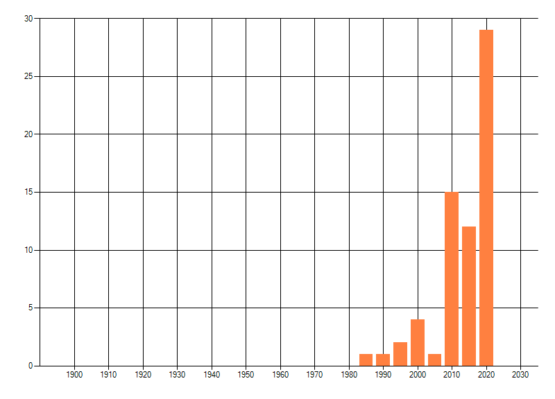 Het aantal atlasblokken (5x5 km) waarin de soort is gemeld binnen een periode van vijf jaar (vanaf 1980) of twintig jaar. Niet gecorrigeerd voor waarnemersinspanning en het aantal doorgegeven waarnemingen kan sterk variëren per periode, dus een trend in verspreiding kan hier niet direct uit worden afgelezen. Het opgegeven jaartal is het eerste jaar van de periode. Bron: gevalideerde waarnemingen uit de NDFF.