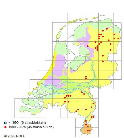 Het aantal atlasblokken (5x5 km) waarin de soort is gemeld binnen een periode van vijf jaar (vanaf 1980) of twintig jaar. Niet gecorrigeerd voor waarnemersinspanning en het aantal doorgegeven waarnemingen kan sterk variëren per periode, dus een trend in verspreiding kan hier niet direct uit worden afgelezen. Het opgegeven jaartal is het eerste jaar van de periode. Bron: gevalideerde waarnemingen uit de NDFF.