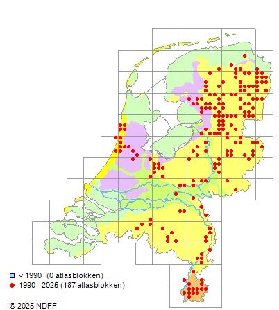 Het aantal atlasblokken (5x5 km) waarin de soort is gemeld binnen een periode van vijf jaar (vanaf 1980) of twintig jaar. Niet gecorrigeerd voor waarnemersinspanning en het aantal doorgegeven waarnemingen kan sterk variëren per periode, dus een trend in verspreiding kan hier niet direct uit worden afgelezen. Het opgegeven jaartal is het eerste jaar van de periode. Bron: gevalideerde waarnemingen uit de NDFF.