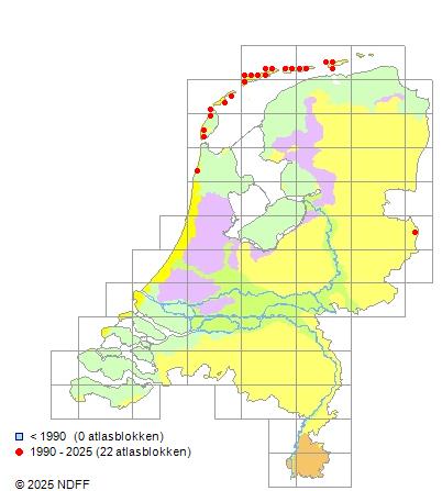 Het aantal atlasblokken (5x5 km) waarin de soort is gemeld binnen een periode van vijf jaar (vanaf 1980) of twintig jaar. Niet gecorrigeerd voor waarnemersinspanning en het aantal doorgegeven waarnemingen kan sterk variëren per periode, dus een trend in verspreiding kan hier niet direct uit worden afgelezen. Het opgegeven jaartal is het eerste jaar van de periode. Bron: gevalideerde waarnemingen uit de NDFF.