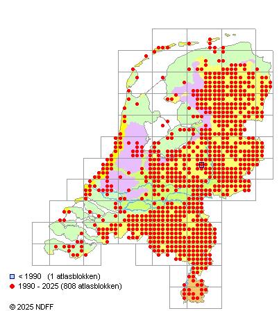 Het aantal atlasblokken (5x5 km) waarin de soort is gemeld binnen een periode van vijf jaar (vanaf 1980) of twintig jaar. Niet gecorrigeerd voor waarnemersinspanning en het aantal doorgegeven waarnemingen kan sterk variëren per periode, dus een trend in verspreiding kan hier niet direct uit worden afgelezen. Het opgegeven jaartal is het eerste jaar van de periode. Bron: gevalideerde waarnemingen uit de NDFF.