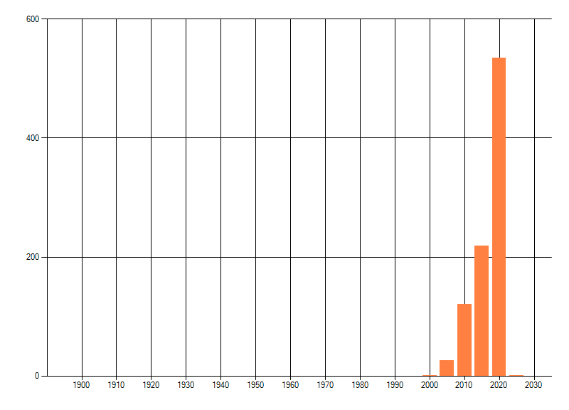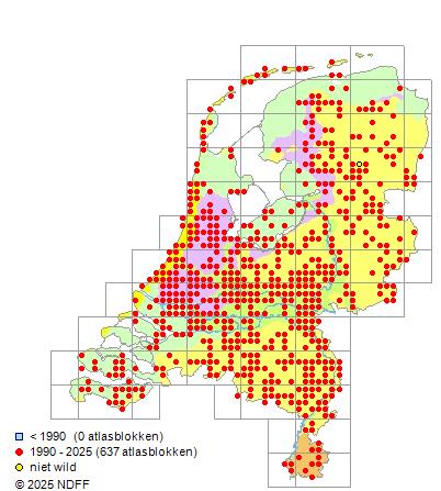 Het aantal atlasblokken (5x5 km) waarin de soort is gemeld binnen een periode van vijf jaar (vanaf 1980) of twintig jaar. Niet gecorrigeerd voor waarnemersinspanning en het aantal doorgegeven waarnemingen kan sterk variëren per periode, dus een trend in verspreiding kan hier niet direct uit worden afgelezen. Het opgegeven jaartal is het eerste jaar van de periode. Bron: gevalideerde waarnemingen uit de NDFF.