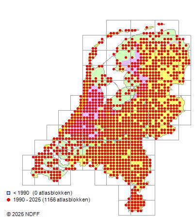 Het aantal atlasblokken (5x5 km) waarin de soort is gemeld binnen een periode van vijf jaar (vanaf 1980) of twintig jaar. Niet gecorrigeerd voor waarnemersinspanning en het aantal doorgegeven waarnemingen kan sterk variëren per periode, dus een trend in verspreiding kan hier niet direct uit worden afgelezen. Het opgegeven jaartal is het eerste jaar van de periode. Bron: gevalideerde waarnemingen uit de NDFF.