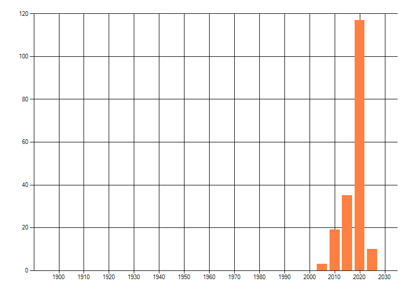 Het aantal atlasblokken (5x5 km) waarin de soort is gemeld binnen een periode van vijf jaar (vanaf 1980) of twintig jaar. Niet gecorrigeerd voor waarnemersinspanning en het aantal doorgegeven waarnemingen kan sterk variëren per periode, dus een trend in verspreiding kan hier niet direct uit worden afgelezen. Het opgegeven jaartal is het eerste jaar van de periode. Bron: gevalideerde waarnemingen uit de NDFF.