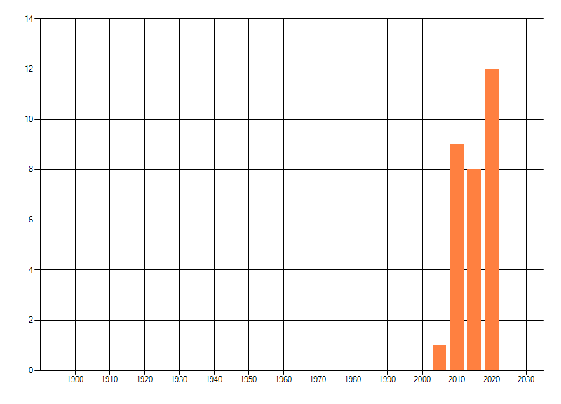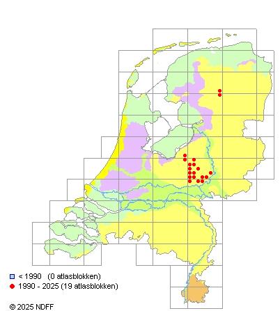 Het aantal atlasblokken (5x5 km) waarin de soort is gemeld binnen een periode van vijf jaar (vanaf 1980) of twintig jaar. Niet gecorrigeerd voor waarnemersinspanning en het aantal doorgegeven waarnemingen kan sterk variëren per periode, dus een trend in verspreiding kan hier niet direct uit worden afgelezen. Het opgegeven jaartal is het eerste jaar van de periode. Bron: gevalideerde waarnemingen uit de NDFF.