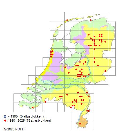 Het aantal atlasblokken (5x5 km) waarin de soort is gemeld binnen een periode van vijf jaar (vanaf 1980) of twintig jaar. Niet gecorrigeerd voor waarnemersinspanning en het aantal doorgegeven waarnemingen kan sterk variëren per periode, dus een trend in verspreiding kan hier niet direct uit worden afgelezen. Het opgegeven jaartal is het eerste jaar van de periode. Bron: gevalideerde waarnemingen uit de NDFF.
