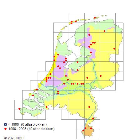 Het aantal atlasblokken (5x5 km) waarin de soort is gemeld binnen een periode van vijf jaar (vanaf 1980) of twintig jaar. Niet gecorrigeerd voor waarnemersinspanning en het aantal doorgegeven waarnemingen kan sterk variëren per periode, dus een trend in verspreiding kan hier niet direct uit worden afgelezen. Het opgegeven jaartal is het eerste jaar van de periode. Bron: gevalideerde waarnemingen uit de NDFF.