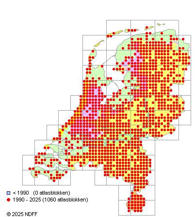Het aantal atlasblokken (5x5 km) waarin de soort is gemeld binnen een periode van vijf jaar (vanaf 1980) of twintig jaar. Niet gecorrigeerd voor waarnemersinspanning en het aantal doorgegeven waarnemingen kan sterk variëren per periode, dus een trend in verspreiding kan hier niet direct uit worden afgelezen. Het opgegeven jaartal is het eerste jaar van de periode. Bron: gevalideerde waarnemingen uit de NDFF.