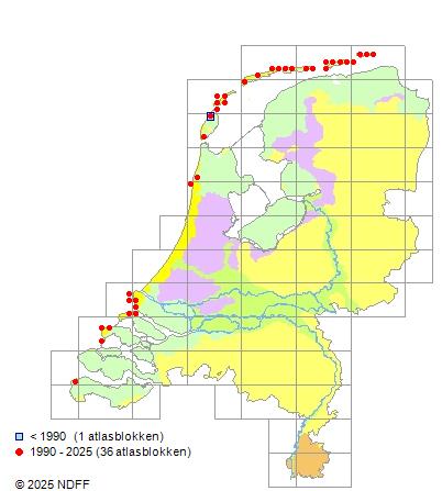 Het aantal atlasblokken (5x5 km) waarin de soort is gemeld binnen een periode van vijf jaar (vanaf 1980) of twintig jaar. Niet gecorrigeerd voor waarnemersinspanning en het aantal doorgegeven waarnemingen kan sterk variëren per periode, dus een trend in verspreiding kan hier niet direct uit worden afgelezen. Het opgegeven jaartal is het eerste jaar van de periode. Bron: gevalideerde waarnemingen uit de NDFF.