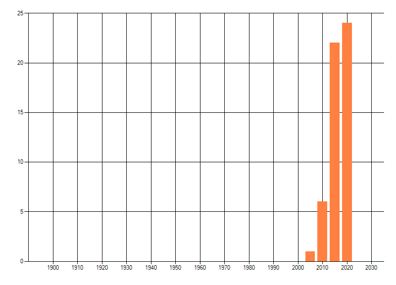Het aantal atlasblokken (5x5 km) waarin de soort is gemeld binnen een periode van vijf jaar (vanaf 1980) of twintig jaar. Niet gecorrigeerd voor waarnemersinspanning en het aantal doorgegeven waarnemingen kan sterk variëren per periode, dus een trend in verspreiding kan hier niet direct uit worden afgelezen. Het opgegeven jaartal is het eerste jaar van de periode. Bron: gevalideerde waarnemingen uit de NDFF.