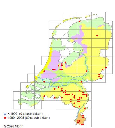 Het aantal atlasblokken (5x5 km) waarin de soort is gemeld binnen een periode van vijf jaar (vanaf 1980) of twintig jaar. Niet gecorrigeerd voor waarnemersinspanning en het aantal doorgegeven waarnemingen kan sterk variëren per periode, dus een trend in verspreiding kan hier niet direct uit worden afgelezen. Het opgegeven jaartal is het eerste jaar van de periode. Bron: gevalideerde waarnemingen uit de NDFF.