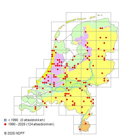 Het aantal atlasblokken (5x5 km) waarin de soort is gemeld binnen een periode van vijf jaar (vanaf 1980) of twintig jaar. Niet gecorrigeerd voor waarnemersinspanning en het aantal doorgegeven waarnemingen kan sterk variëren per periode, dus een trend in verspreiding kan hier niet direct uit worden afgelezen. Het opgegeven jaartal is het eerste jaar van de periode. Bron: gevalideerde waarnemingen uit de NDFF.
