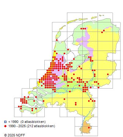 Het aantal atlasblokken (5x5 km) waarin de soort is gemeld binnen een periode van vijf jaar (vanaf 1980) of twintig jaar. Niet gecorrigeerd voor waarnemersinspanning en het aantal doorgegeven waarnemingen kan sterk variëren per periode, dus een trend in verspreiding kan hier niet direct uit worden afgelezen. Het opgegeven jaartal is het eerste jaar van de periode. Bron: gevalideerde waarnemingen uit de NDFF.