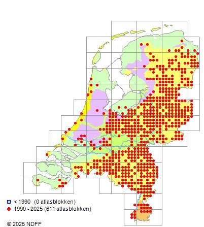 Het aantal atlasblokken (5x5 km) waarin de soort is gemeld binnen een periode van vijf jaar (vanaf 1980) of twintig jaar. Niet gecorrigeerd voor waarnemersinspanning en het aantal doorgegeven waarnemingen kan sterk variëren per periode, dus een trend in verspreiding kan hier niet direct uit worden afgelezen. Het opgegeven jaartal is het eerste jaar van de periode. Bron: gevalideerde waarnemingen uit de NDFF.