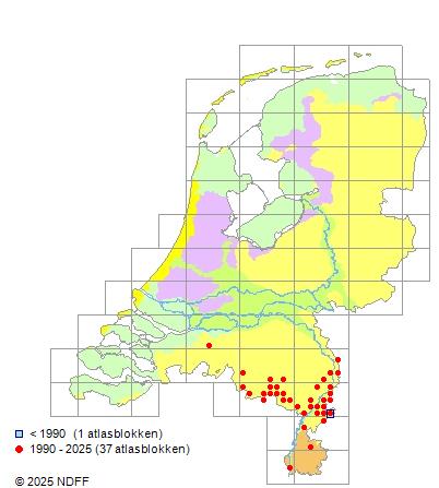 Het aantal atlasblokken (5x5 km) waarin de soort is gemeld binnen een periode van vijf jaar (vanaf 1980) of twintig jaar. Niet gecorrigeerd voor waarnemersinspanning en het aantal doorgegeven waarnemingen kan sterk variëren per periode, dus een trend in verspreiding kan hier niet direct uit worden afgelezen. Het opgegeven jaartal is het eerste jaar van de periode. Bron: gevalideerde waarnemingen uit de NDFF.